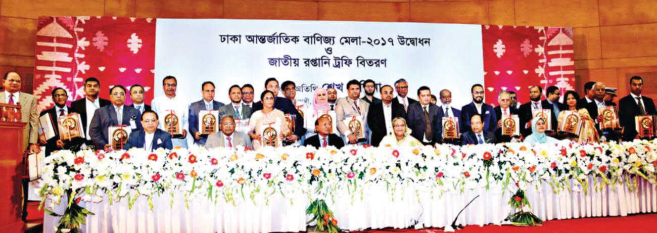 ACCOLADES FOR TOP EXPORTERS: Prime Minister Sheikh Hasina hands over National Export Trophy for fiscal 2013-14 to top exporters, at the inaugural ceremony of Dhaka International Trade Fair 2017, at Bangabandhu International Conference Centre in Dhaka Hasina urged the businesses and exporters to stay updated on the changing regime of global trade. WTO rules are making the global trade more liberal, Hasina said.
